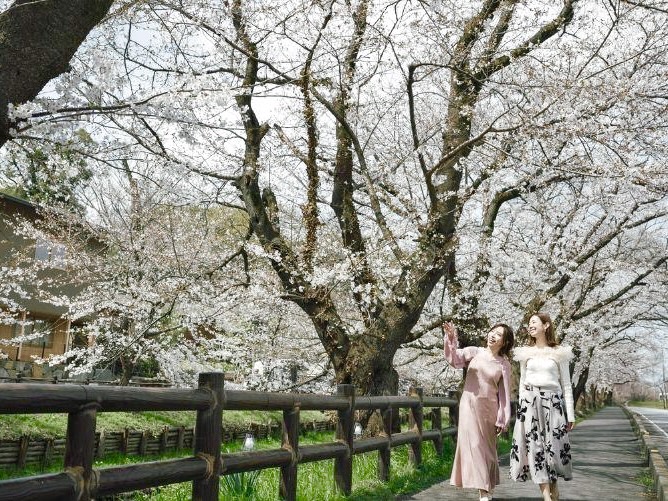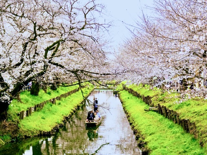 川越氷川神社裏手を流れる桜名所で、花筏と桜並木の絶景を水上からご堪能いただけます。